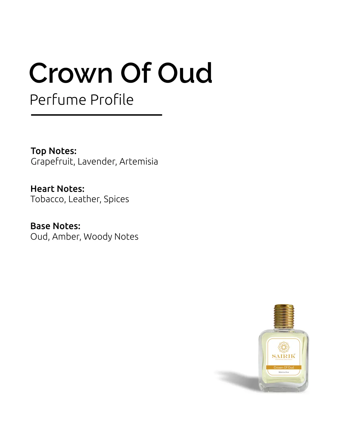 Product Overview: Inspired By Chopard Oud Malaki, Crown Of Oud Is A Majestic, Smoky-oud Fragrance Exuding Depth And Masculinity. It Opens With Spicy Grapefruit And Lavender, Transitions Into A Heart Of Tobacco And Leather, And Finishes With A Powerful Base Of Oud, Amber, And Dark Woods.