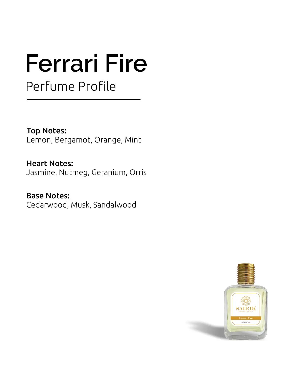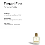 Product Overview: Inspired By Ferrari Red, Ferrari Fire Is A Dynamic Citrus-aromatic Fragrance That Radiates Sporty Confidence. It Opens With Vibrant Lemon And Bergamot, Drives Into A Heart Of Jasmine And Nutmeg, And Finishes With A Clean, Masculine Base Of Cedarwood And Musk.