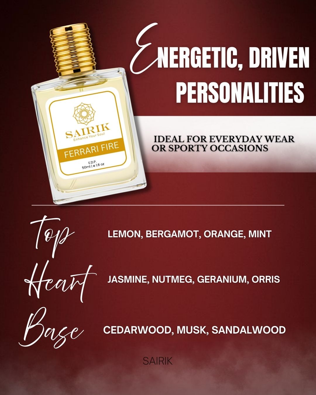 - Base: Cedarwood, Musk, Sandalwood