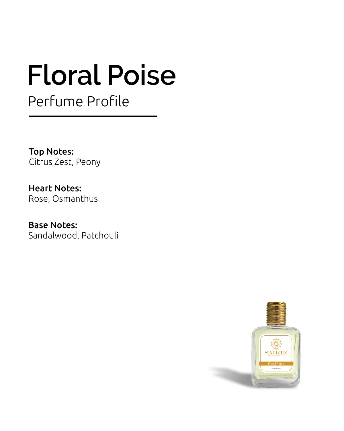 Product Overview: Inspired By Gucci Flora, Floral Poise Is A Graceful, Youthful Floral Fragrance That Radiates Charm And Elegance. It Opens With Fresh Citrus And Peony, Reveals A Romantic Heart Of Rose And Osmanthus, And Settles Into A Soft, Creamy Base Of Sandalwood And Patchouli.