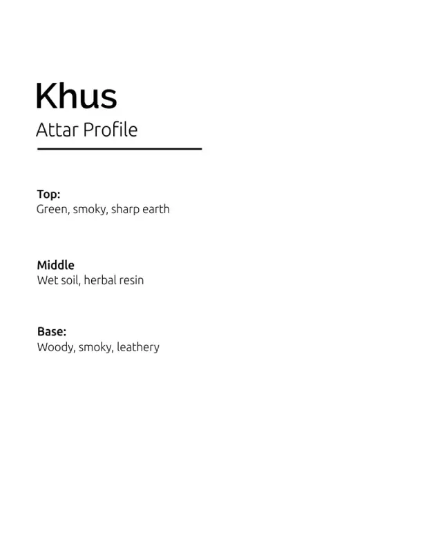 Product Overview: Khus is a refreshing, cooling attar built around vetiver’s earthy greenness with woody support for a grounding effect.