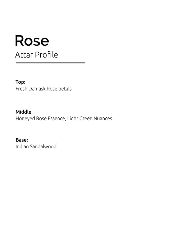 Product Overview: Rose attar expresses the true bloom of fresh rose petals—radiant, honeyed, and elegantly rounded.